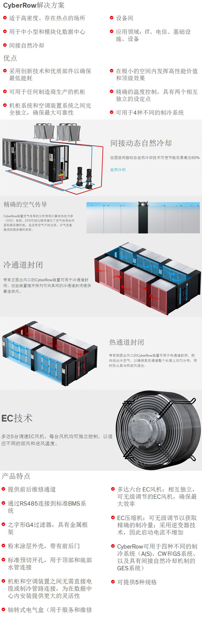 CyberRow是用于高密度機柜定向制冷的空調裝置。CyberRow中利用最先進的技術增強了創新的水平式空氣傳導方式,促進其高性能、高靈活性和高效率。波動的服務器機柜負載、空間限制、缺乏高架地板、現有的高密度服務器技術—這些日常實踐中的棘手情況都是開發CyberRow旨在處理的問題。