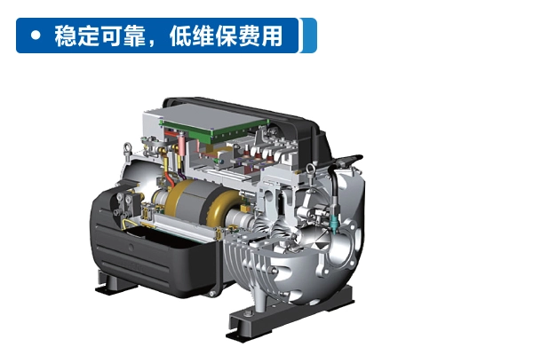 磁懸浮軸承使得運動部件完全懸浮,壓縮機內(nèi)部完全無摩擦運行,結(jié)構(gòu)震動接近0,運行噪音低,無需昂貴的減震配件。