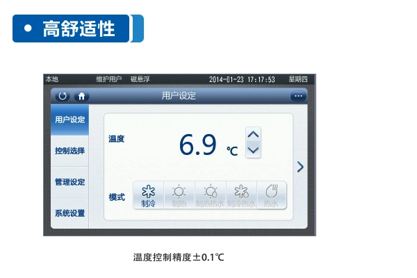 采用磁懸浮變頻壓縮機,機組可實現(xiàn)2%100%負荷連續(xù)智能調(diào)節(jié),出水溫度控制精度±0.1℃,溫度波動小,舒適性高。