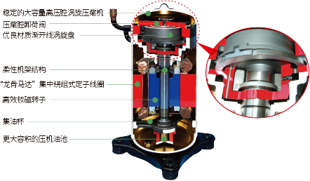 *注:側(cè)出風(fēng)機(jī)型采用直流變頻雙轉(zhuǎn)子壓縮機(jī),頂出風(fēng)機(jī)型采用直流變頻渦旋壓縮機(jī)。右圖以224型頂出風(fēng)室外機(jī)產(chǎn)品的壓縮機(jī)為例。