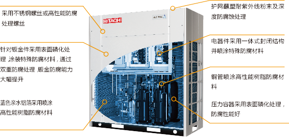 日立無懼沿海等特殊應用場合,采用高精尖防腐蝕技術和防腐材料,延長空調機組正常的使用壽命,針對各類部件的防腐技術,如下圖所示: